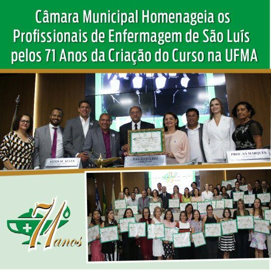 A Câmara Municipal de São Luís, realizou Sessão Solene de autoria do Vereador Pavão Filho, no dia 25 de outubro de 2019, em homenagem aos Profissionais de Enfermagem de São Luís pelos 71 Anos da Criação do Curso na Universidade Federal do Maranhão –UFMA.