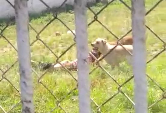 Ao perceberem o ataque, vizinhos atiraram pedras e pedaços de paus para tentar afastar os quatro vira-latas, um pitbull e um rotweiller.