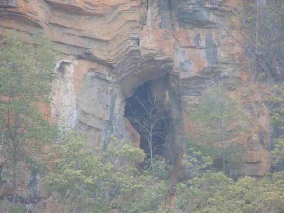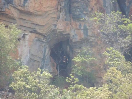 Essa gruta possui uma segunda entrada pelo teto desmoronado, por onde entra luz solar.