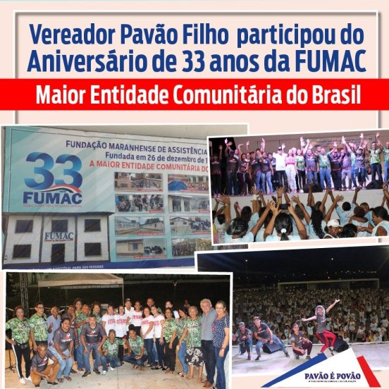 O Vereador Pavão Filho, participou do aniversário de 33 anos da Fundação Maranhense de Assistência Comunitária –FUMAC, fundada em 26 de dezembro de 1986, considerada a maior Entidade Comunitária do Brasil.