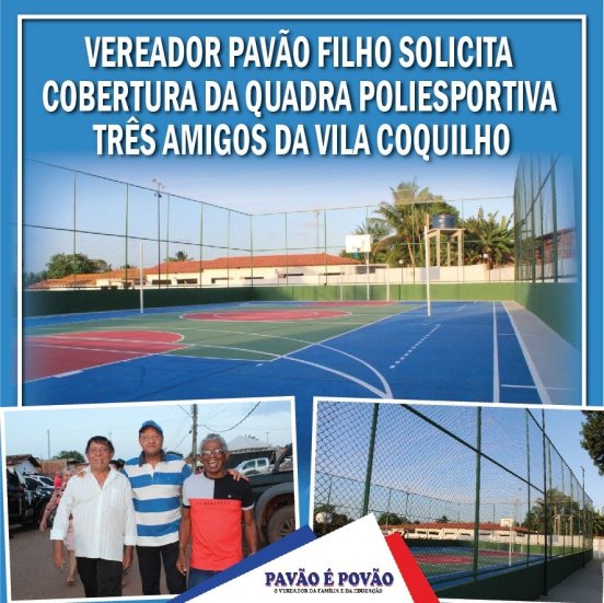 O Vereador Pavão Filho, apresentou indicação nº326/19, aprovada pela Câmara Municipal de São Luís, solicitando ao Governo do Estado por meio da Agência Executiva Metropolitana – AGEM a COBERTURA DA QUADRA POLIESPORTIVA TRÊS AMIGOS DA COMUNIDADE DA VILA COQUILHO.