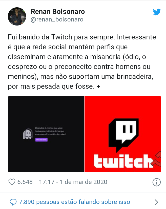 Renan Bolsonaro classifica a expulsão do Twitch como uma forma de ataque indireto ao pai. “Muitos perfis utilizaram a brincadeira fora de contexto e diante toda essa briga política.
