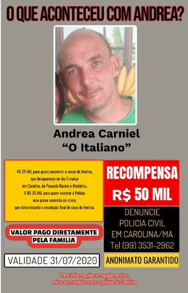 Conhecido como “o Italiano”, Andrea Carniel sumiu na manhã de 5 de Março deste ano, da Pousada Bastos e Medeiros, onde ele morava, na BR-230, a 15 km de Carolina (MA). Desde então, ninguém teve mais notícias dele. A Polícia Civil de Carolina abriu inquérito por homicídio.