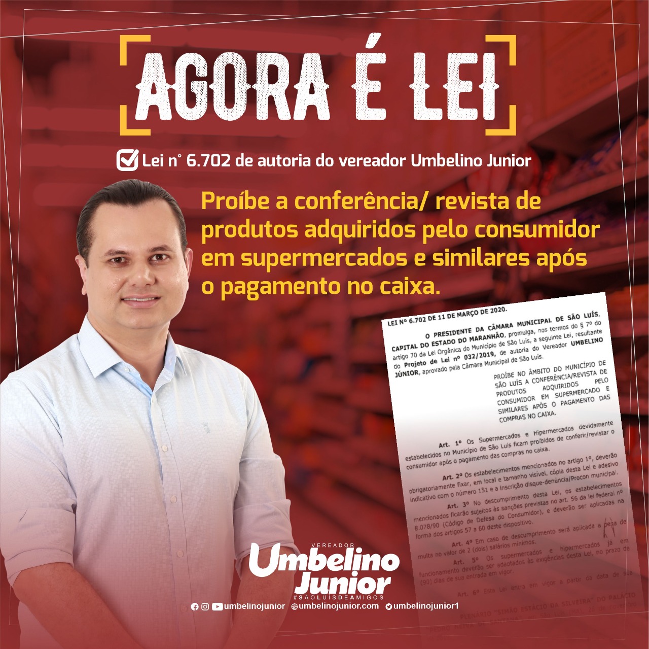 Foi sancionada a lei n° 6.702 de autoria do vereador @umbelinojunior que proíbe a conferência/ revista de produtos adquiridos pelo consumidor em supermercados e similares após o pagamento no caixa. Uma importante vitória para nós consumidores 🙏🏻