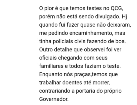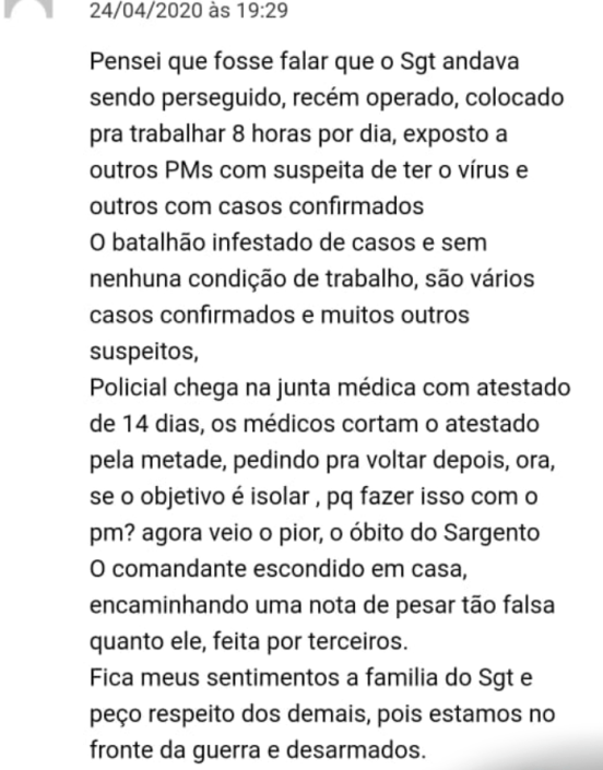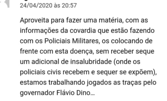 “Somente as balas de oxigênio, não tem um monitor, não tem um aspirador, se o paciente precisar ser aspirado o pulmão encharcado de secreção, o que vão fazer? aí eles falam que o hospital de São José de Ribamar tá preparado para receber paciente com COVID19 tudo mentira e os pobres, os pacientes acreditam tá aí a prova o hospital cheio de paciente com com COVID19 todo dia morre paciente hospital de Ribamar de terça-feira até ontem (30/04/2020), já se foram nove”.