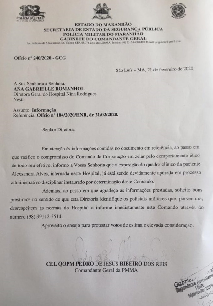 A policial Alexsandra Figueiredo Alves, vítima de agressões dentro do Comando Geral da PM do Maranhão, em junho de 2017, está passando por tratamento no Hospital Nina Rodrigues e enfrenta dificuldades financeiras. A revelação foi feita em um vídeo compartilhado pelo soldado Aires em grupos de WhatsApp.