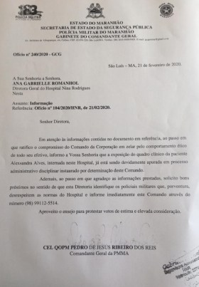 Um grupo e amigos da PM passou a visitar a paciente, o que não vem agradando a direção do Nina Rodrigues e até o aparelho de Alexsandra foi tomado para evitar filmagens que possam expor as condições precárias do hospital.