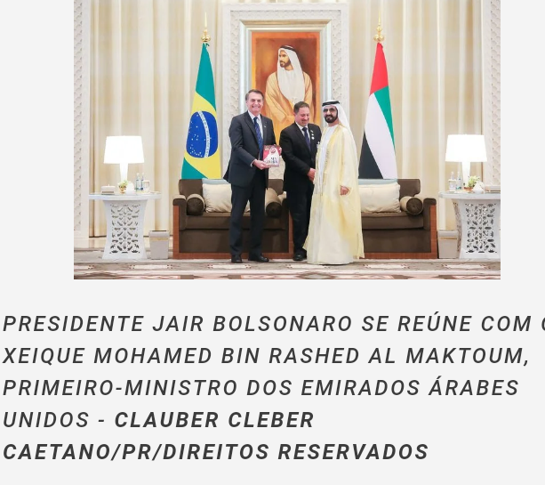 Segundo o Ministério das Relações Exteriores (MRE) brasileiro, Bolsonaro e o xeique Mohammed bin Zayed Al Nahyan, príncipe herdeiro de Abu Dhabi, assinaram acordos nos campos de inteligência artificial, meio ambiente, defesa, comércio e cooperação aduaneira.