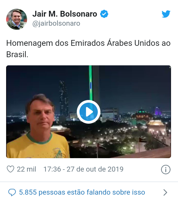 Pelas redes sociais, o presidente falou sobre uma homenagem que foi feita ao Brasil pelos Emirados Árabes. Confira: