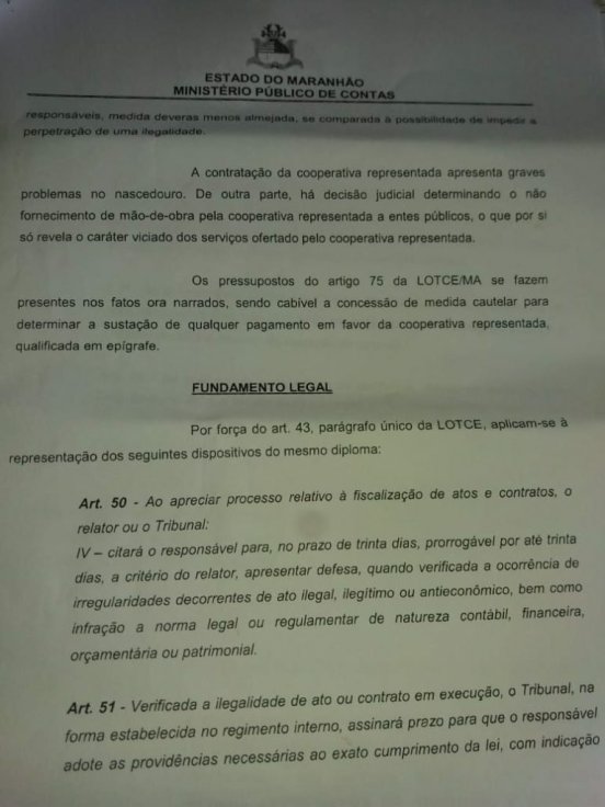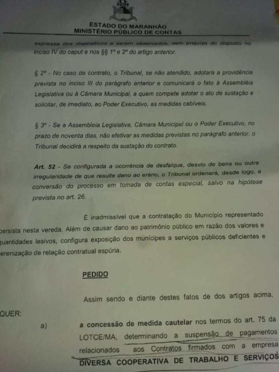 Além da liminar para a suspensão do contrato, o Ministério Público do Maranhão requer, ao final do processo, que a Justiça determine a rescisão definitiva do contrato entre o Município de Cantanhede e a Diversa Cooperativa de Trabalho e Serviços Múltiplos.