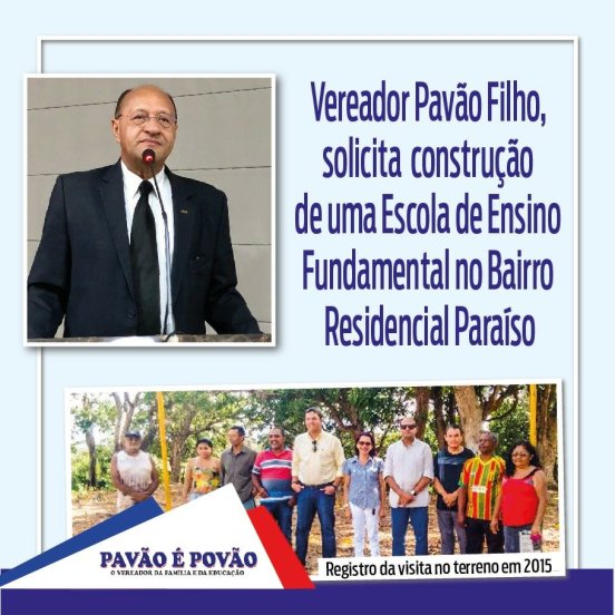 O Vereador Pavão Filho, luta desde 2015 pela CONSTRUÇÃO DE UMA ESCOLA DE ENSINO FUNDAMENTAL NO BAIRRO RESIDENCIAL PARAÍSO, conforme requerimento 505/2015, em terreno disponível para tal finalidade.