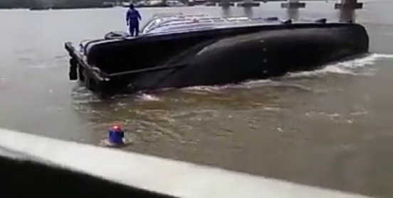 Veja o momento, em que a tripulação se joga na água, antes do rebocador ser engolido pelo rio.