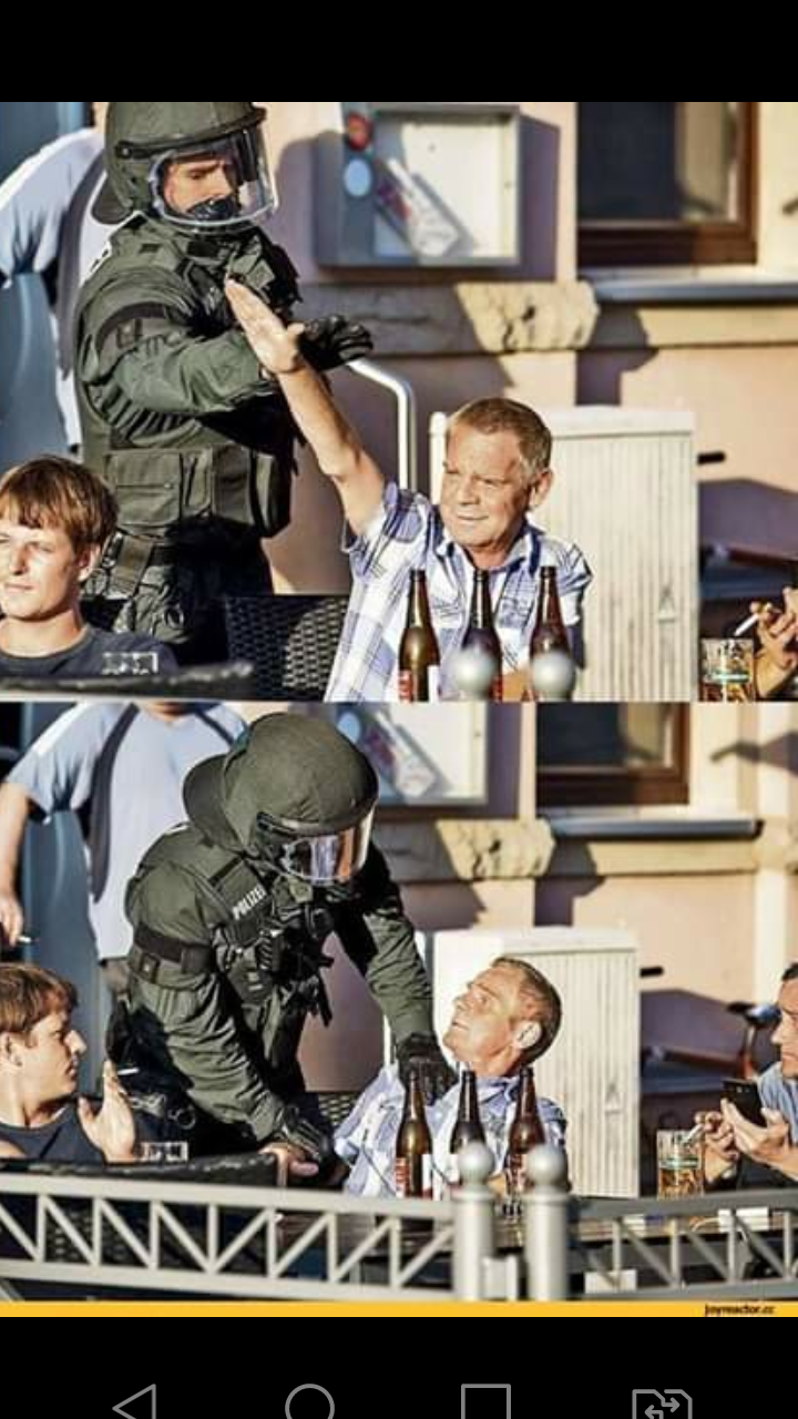Calmamente um policial se aproximou por trás, abaixou os braços do fascista, e lhe informou que ele será processado por “uso de gestos imputáveis às organizações institucionais”.